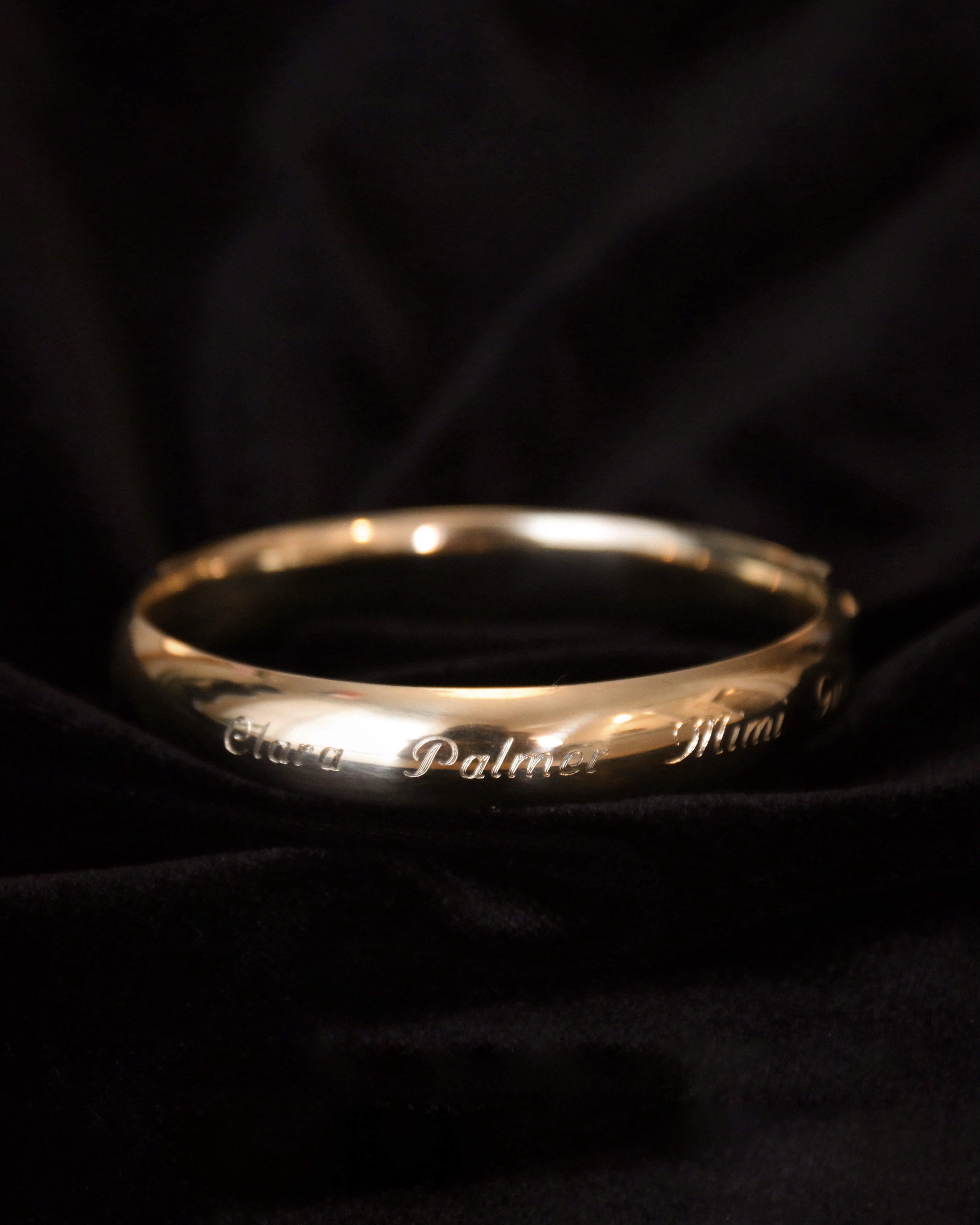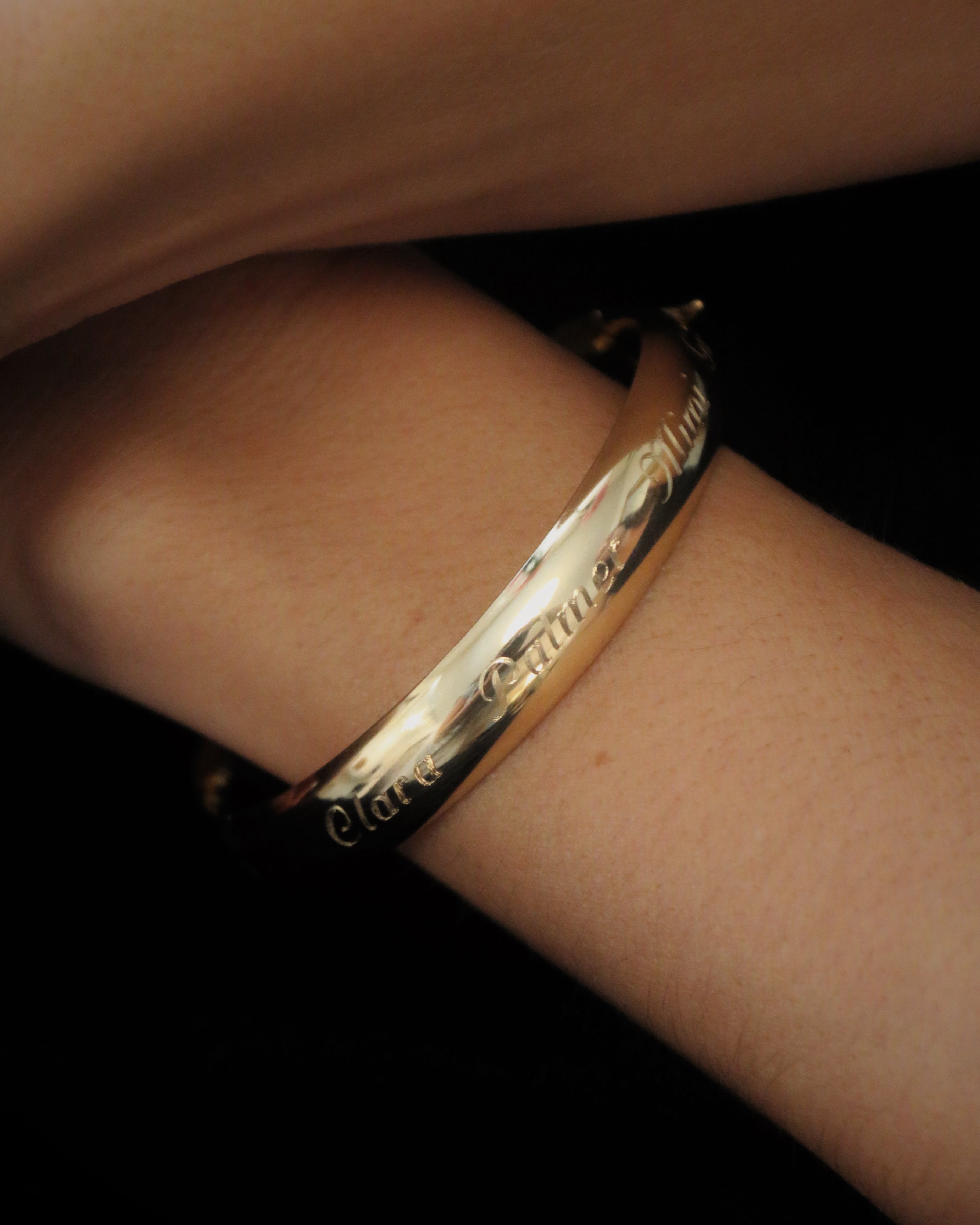 The piece is a heirloom-worthy 14K Gold bangle designed to carry the names, dates, and words that matter most to you. Minimal by design and made to live with you, it’s the kind of everyday elegance that gets better with meaning.