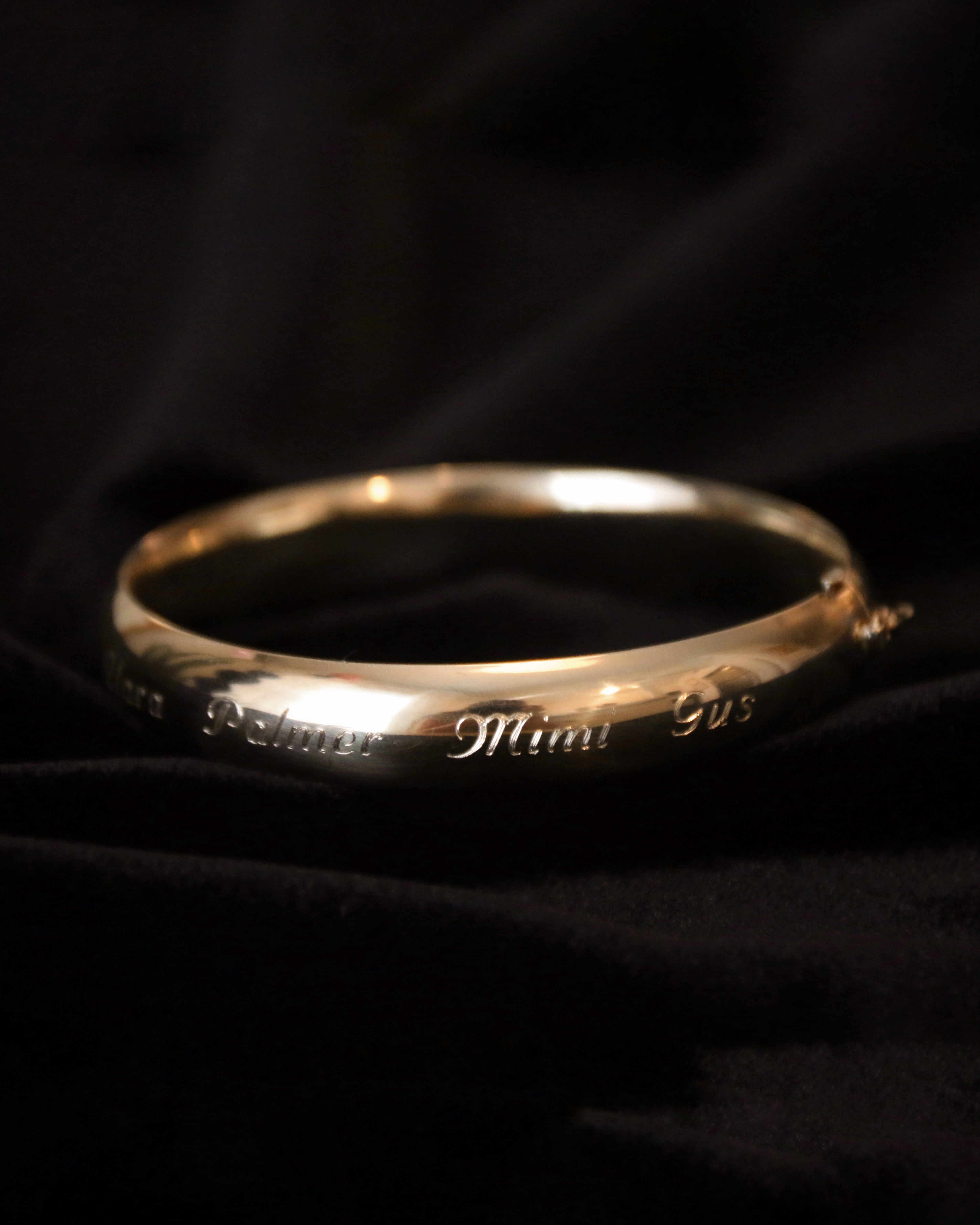 Each bangle is crafted to order—engraved, polished, and finished by hand. Please allow 4-8 weeks before shipping.