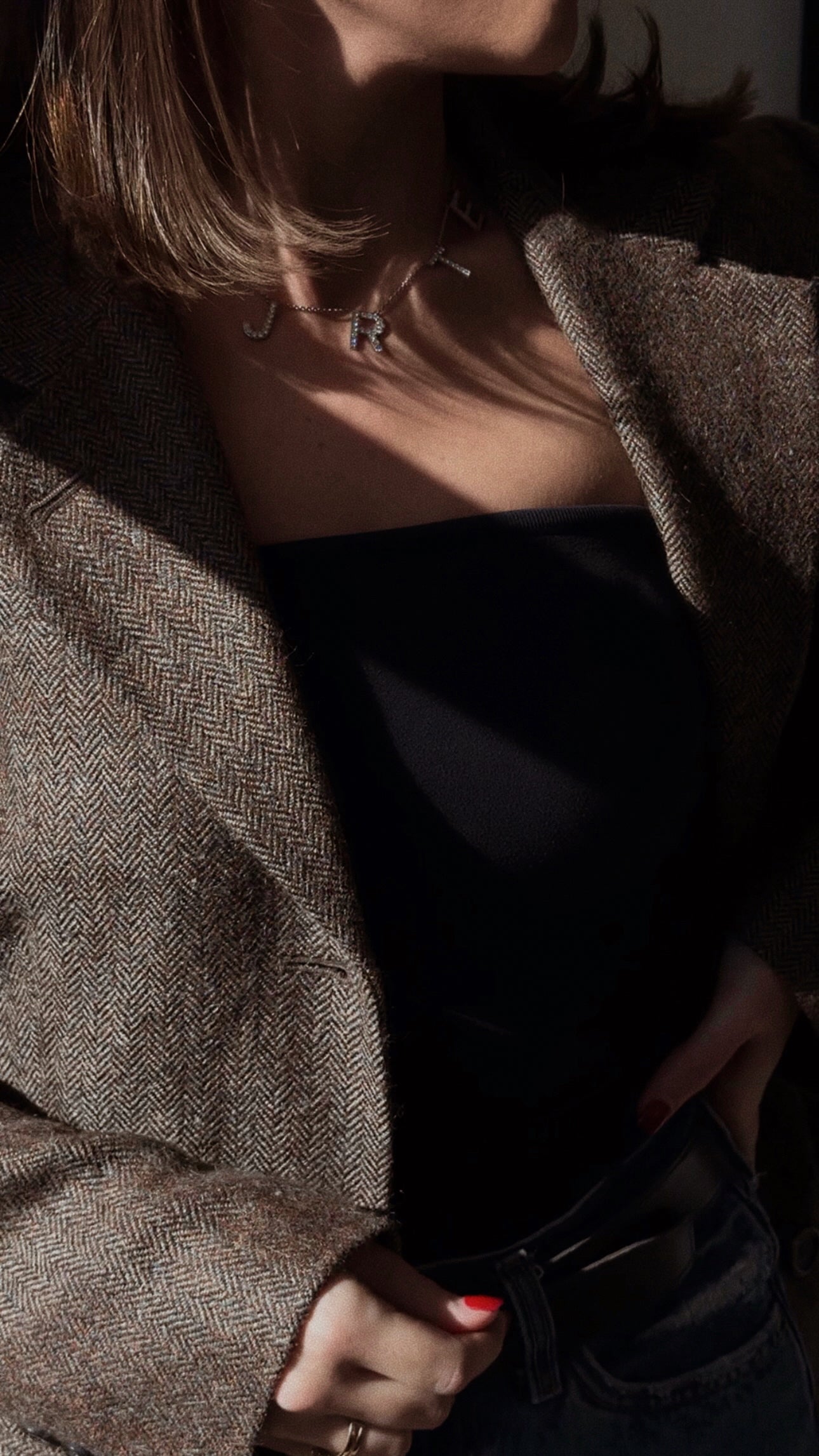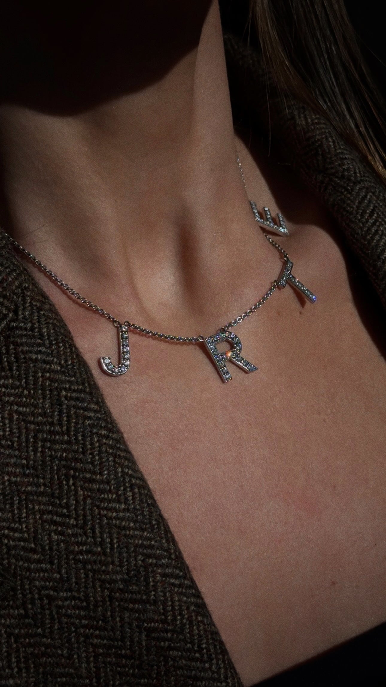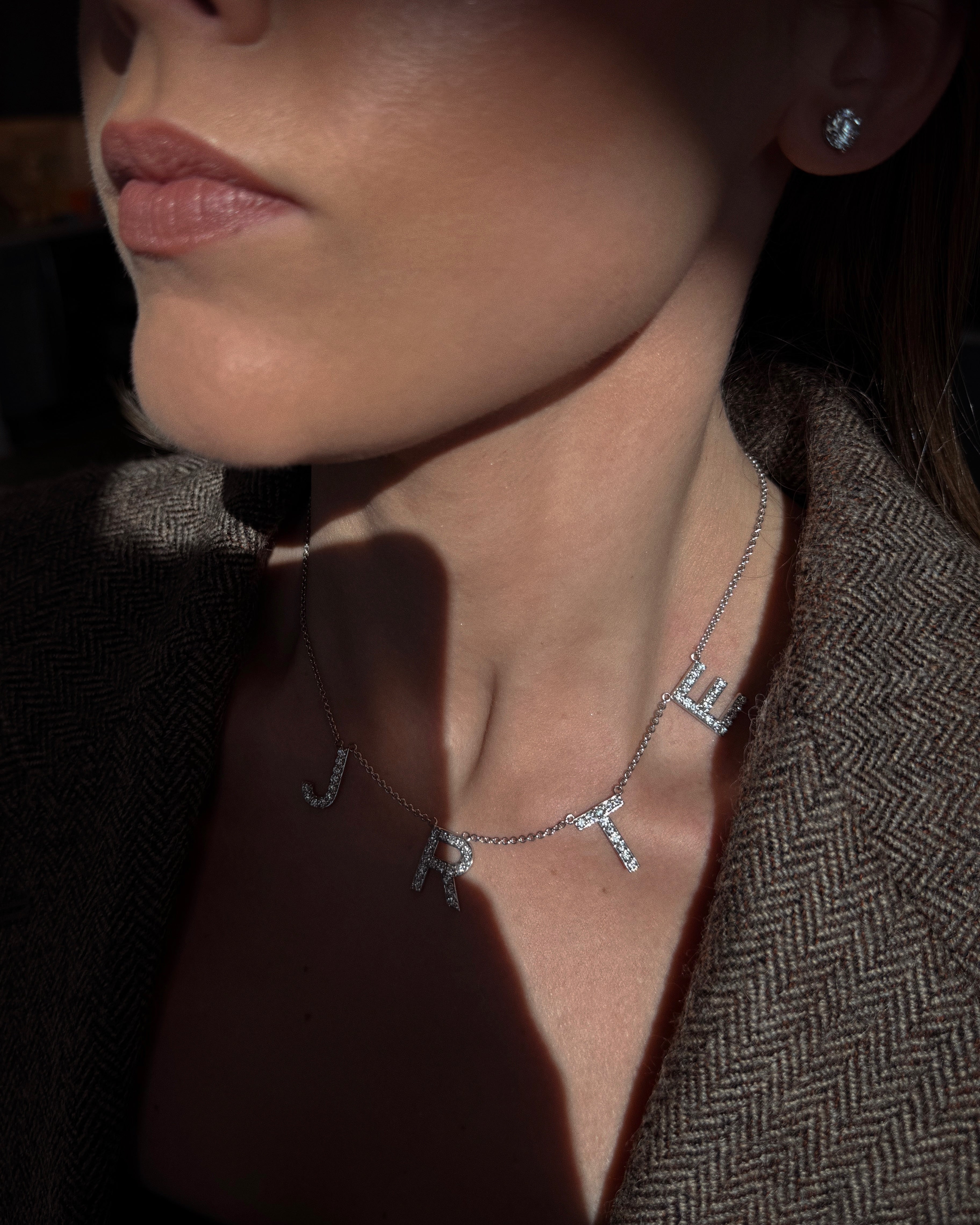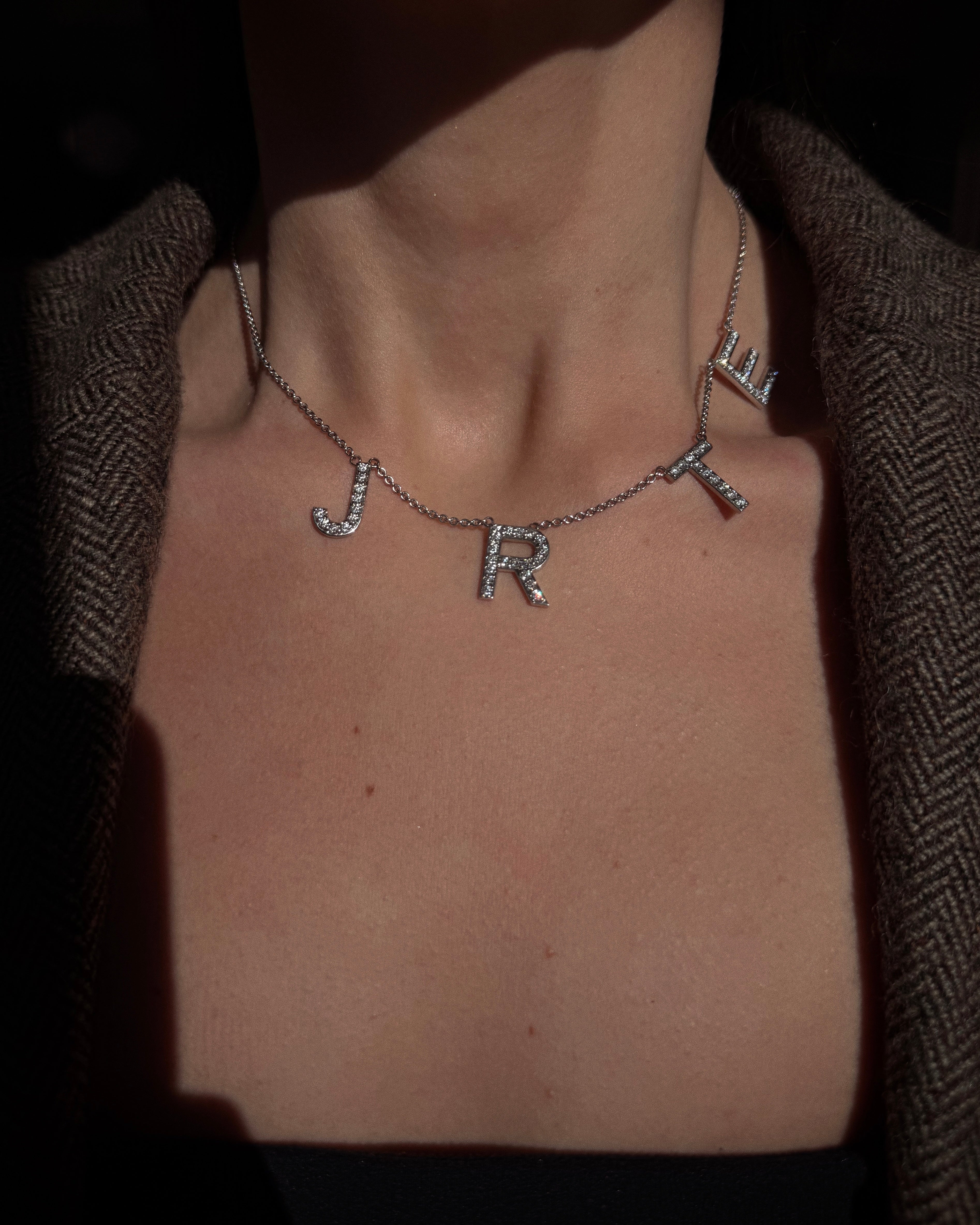 A custom-made necklace designed for a mother of three. This stunning piece displays the first initial of each child, set with sparkling diamonds. Its asymmetrical design gives it an effortless, modern look — the perfect piece to wear layered with other necklaces or as a stand-alone statement.